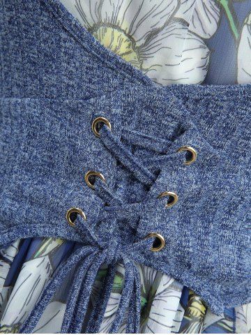 Plus Size Flowers Leaf Print Ruffles Cami Dress With Grommets Lace Up Marled Ribbed Top - Deep Blue - 3x | Us 22-24