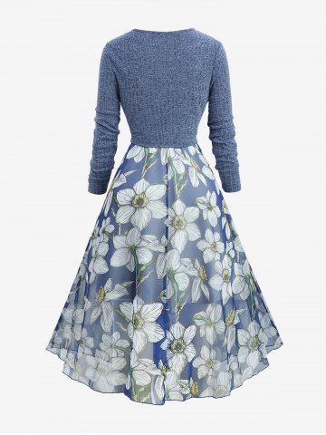 Plus Size Flowers Leaf Print Ruffles Cami Dress With Grommets Lace Up Marled Ribbed Top - Deep Blue - 4x | Us 26-28