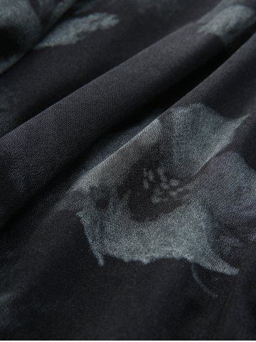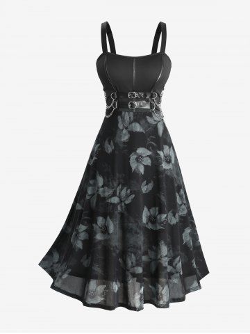 Plus Size Flowers Print Grommets Buckle Chains Tank Dress - Black - 5x | Us 30-32