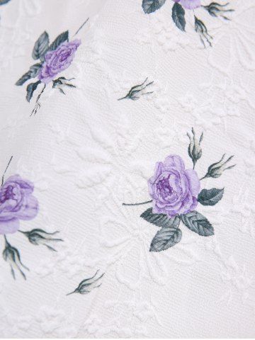 E*****y5Plus Size Flowers Print Embossed Butterfly Chain Panle Ruched Lace Up Grommets Ruffles Textured High Low DressColor: PURPLE Size: 3X | US 22-24Absolutely adorable and comfortable dress! Both cute and pretty! Perfect for an afternoon tea!