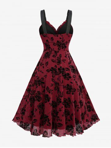 Casual Dresses > Plus Size Glitter Floral Leaves Flocking Lace Up Surplice A Line Party Dress