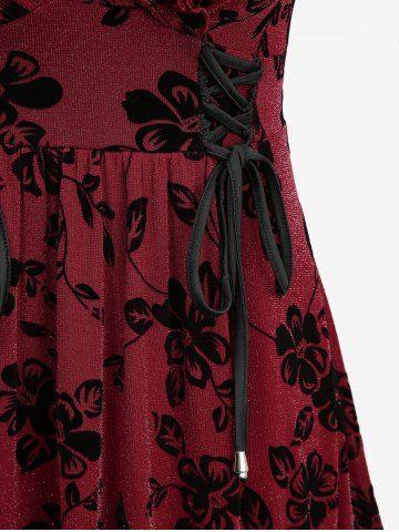 Plus Size Glitter Floral Leaves Flocking Lace Up Surplice A Line Party Dress - Deep Red - 3x | Us 22-24