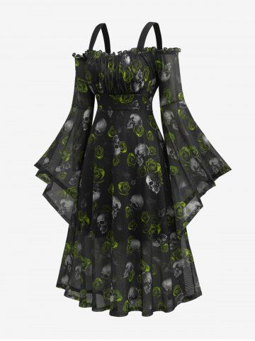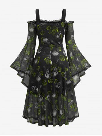 Plus Size Gothic Skull Rose Print Mesh Bell Sleeves Cold Shoulder Dress - Green - 1x | Us 14-16