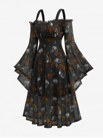 Casual Dresses > Plus Size Gothic Skull Rose Print Mesh Bell Sleeves Cold Shoulder Dress