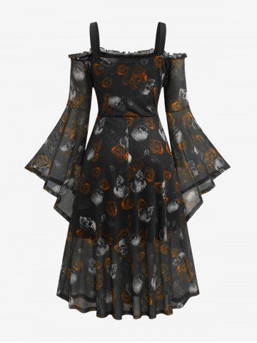 Casual Dresses > Plus Size Gothic Skull Rose Print Mesh Bell Sleeves Cold Shoulder Dress