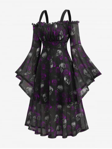 Plus Size Gothic Skull Rose Print Mesh Bell Sleeves Cold Shoulder Dress - Purple - 5x | Us 30-32