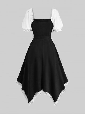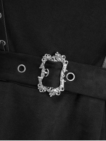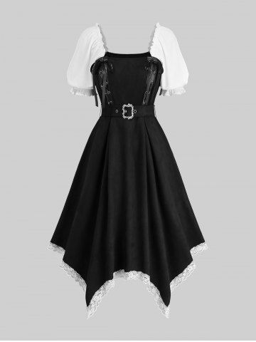 Plus Size Grommets Lace-up Lace Trim Ruffles Asymmetrical Dress With Belt - Black - 1x | Us 14-16