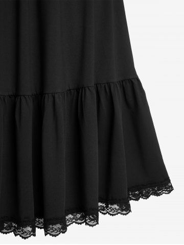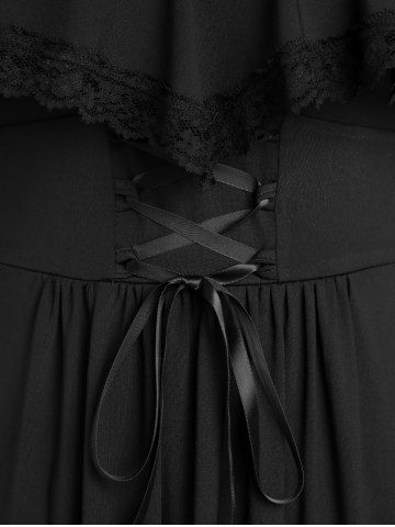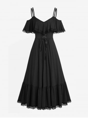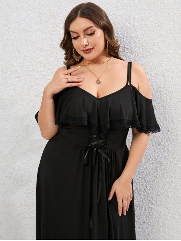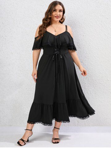 Plus Size Lace Trim Lace-up Maxi Cold Shoulder Flounce Dress - Black - 1x | Us 14-16