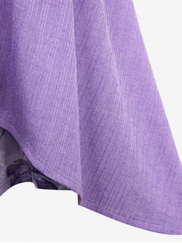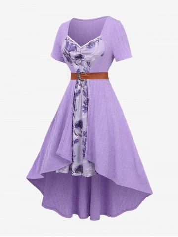 E*****y5Plus Size Flowers Print Embossed Butterfly Chain Panle Ruched Lace Up Grommets Ruffles Textured High Low DressColor: PURPLE Size: 3X | US 22-24Absolutely adorable and comfortable dress! Both cute and pretty! Perfect for an afternoon tea!