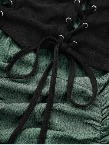 B*****a5Color: DEEP GREEN Size: 5X | US 30-32I'm 5 ft 6in; under bust 47in; bust 53in; waist (aka belly lol) 52in; hips 53in. I bought size 5x just because I can't stand tight clothes around my stomach. I could have gone with 4x. The green cloth has a small elastic band right under the girls (baby doll style). I believe that is a determining factor of measurements. The green cloth is SUPER stretchy!! The black, half vest has moderate stretch. The fact that I bought a 5x, there is plenty of extra room; the lace-up in the black material has a lot of slack, so it's actually hard to tell what it is.. but it is still Cute As HeL·L.
