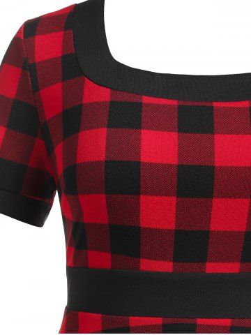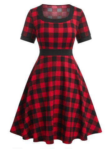 Plus Size Plaid Knee Length 1950s Dress - Red - 4x