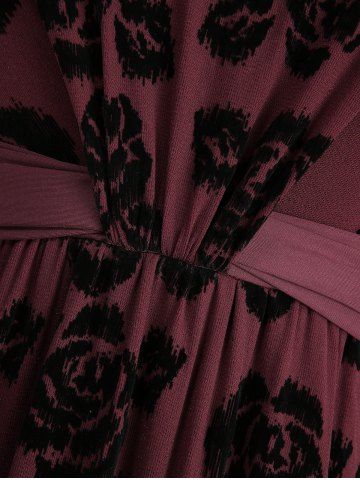 Plus Size Rose Flower Print Ruffles Lace Trim Ruched Cold Shoulder Tank Dress - Deep Red - L | Us 12