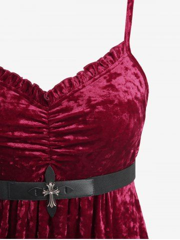 Plus Size Ruched Ruffles Velvet Cami Dress With Belt And Cross Floral Flocking Mesh Hooded Ponchos Cloak - Red - L | Us 12