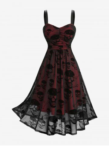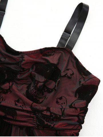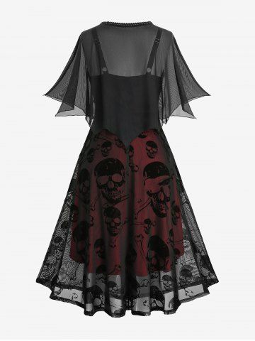 Plus Size Ruched Skull Flocking Mesh Tank Dress With Lace Trim Button Cover Cape - Red - 3x | Us 22-24