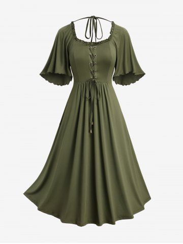 Casual Dresses > Plus Size Ruffles Grommets Lace Up Halter Square Neck Dress