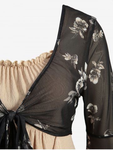 Casual Dresses > Plus Size Ruffles Ruched Plisse Cami Dress With Rose Flower Leaf Print Mesh Flare Sleeves Top