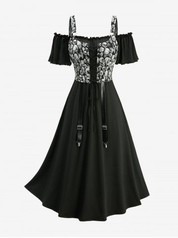 Plus Size Skulls Print Grommets Lace Up Ruffles Cold Shoulder High Low Dress - Black - 1x | Us 14-16
