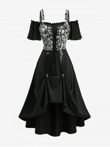 Plus Size Skulls Print Grommets Lace Up Ruffles Cold Shoulder High Low Dress - Black - 2x | Us 18-20