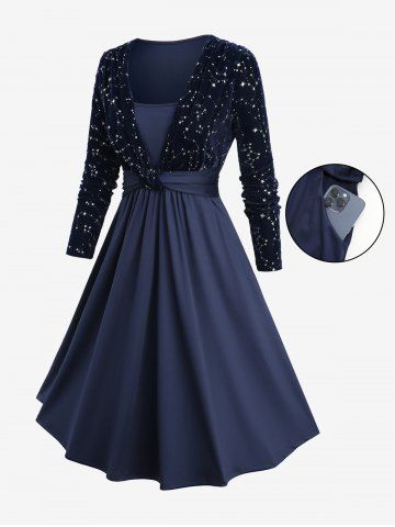 Casual Dresses > Plus Size Star Silver Stamping Velvet Pocket Ruched 2 In 1 Dress