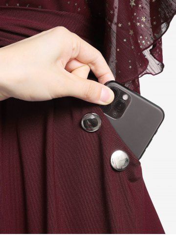 O*****n4Plus Size Stars Print Buckle Button Pockets Ruched Butterfly Sleeves DressColor: DEEP BLUE Size: 3X | US 22-24it's just as pretty as the image. It falls just above knee length on me (5'6, 3X, size 22) it is very soft and comfortable to wear. and the pockets are deep enough to be useful.