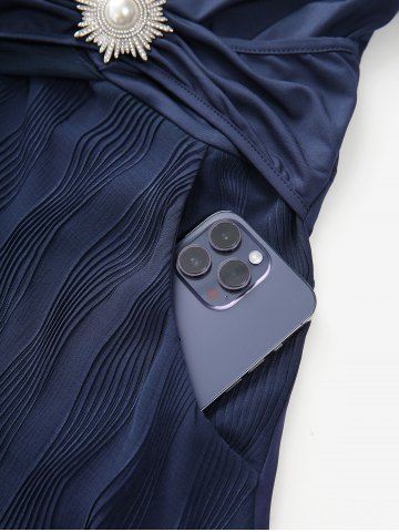 Plus Size Surplice Ruffles Ruched Lettuce Trim Pearl Pin Tulip Hem Pocket Jacquard Dress - Deep Blue - 4x | Us 26-28