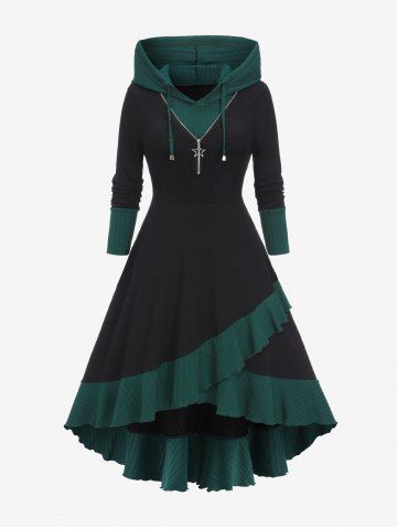 D*****e5Plus Size Tulip Hem Ruffles Star Zipper Drawstring Hooded DressColor: BLACK Size: 4X | US 26-28Absolutely love love love this dress. It's warm it fits well, I get so many compliments. It's great for at home or on the go outdoors. I get so many compliments when I'm out walking my dog wearing this. The material is nice, and it washes up super easy. I love the color and the coverage of the dress. The hoods a nice touch.