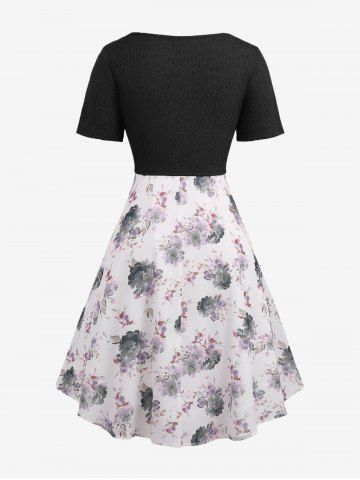 Plus Size Twist Buckle Grommets Ribbed Textured Top and Flower Printed Ruched Cami Dress - Black - 5x | Us 30-32