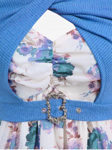 Plus Size Twist Buckle Grommets Ribbed Textured Top and Flower Printed Ruched Cami Dress - Blue - 3x | Us 22-24