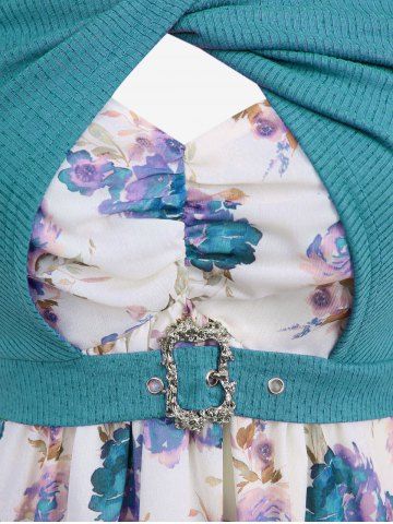 Plus Size Twist Buckle Grommets Ribbed Textured Top and Flower Printed Ruched Cami Dress - Green - L | Us 12