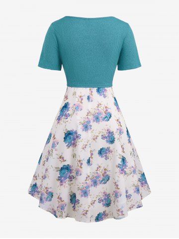 Plus Size Twist Buckle Grommets Ribbed Textured Top and Flower Printed Ruched Cami Dress - Green - 2x | Us 18-20