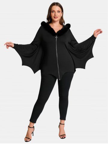 Plus Size Coats > Plus Size Fur Neck Cross Zipper Bat Wing Hooded Coat