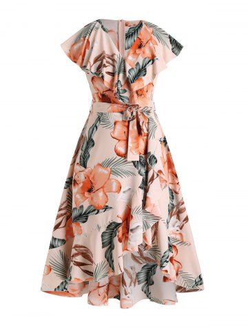 Plus Size & Curve Leaf Floral Ruffle Slit Belted Asymmetrical Hem Maxi Summer Dress - Light Pink - 1x