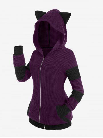 Plus Size Jackets > Plus Size Cat Ear Ribbed Colorblock Hooded Jacket