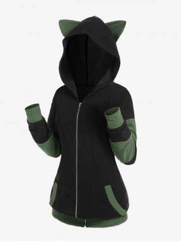 Plus Size Cat Ear Ribbed Colorblock Hooded Jacket - Green - 3x | Us 22-24
