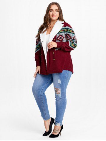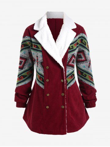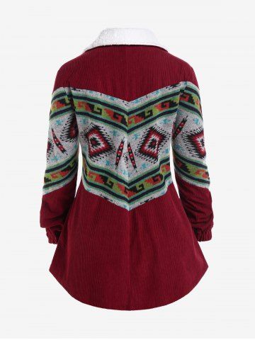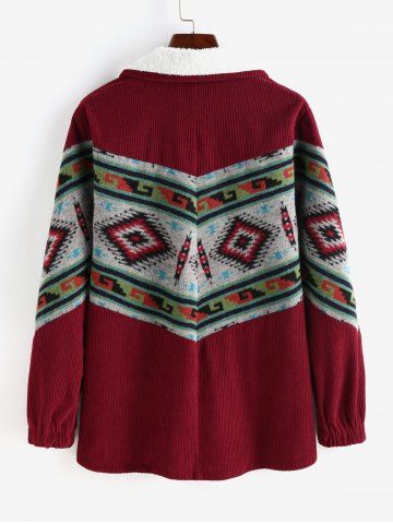 Plus Size Ethnic Jacquard Combo Corduroy Faux Shearling Jacket - Deep Red - 1x | Us 14-16
