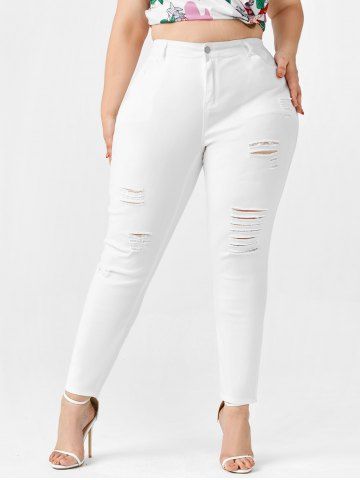Plus Size High Waist Distressed Ripped Jeans - White - 1x