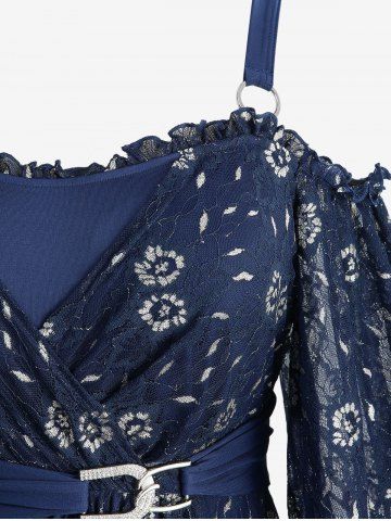Plus Size Cold Shoulder Flare Sleeve Flower Lace Overlay Belted A Line Dress - Blue - 4x | Us 26-28