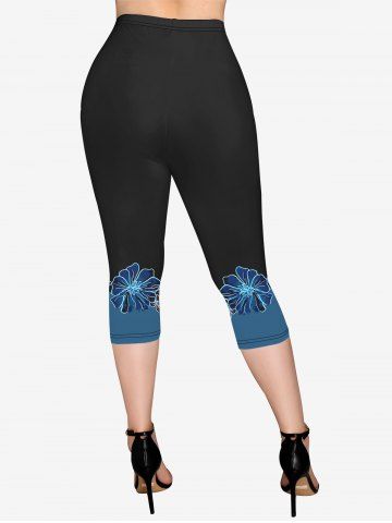 Plus Size Colorblock Flower Print Pockets Capri Leggings - Black - M