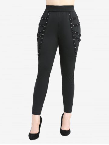 Plus Size Leggings > Plus Size Straps Grommet D-Ring Heart Buckle Solid Skinny Leggings