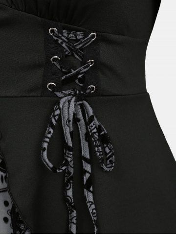 Gothic Plus Size Floral Figure Print Lace Up Ruched Ruffles Bell Sleeves Tops - Gray - 1x | Us 14-16