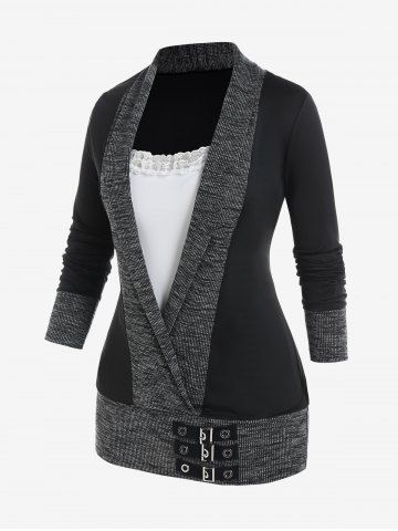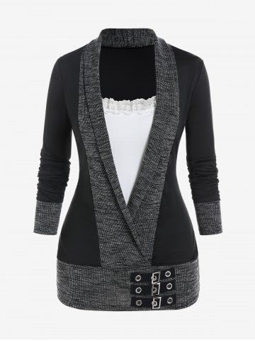 a*****h5Buckles Lace Trim Shawl Neck Twofer T Shirt and 3D Jeans Printed Leggings Plus Size Fall OutfitColor: GRAYfits great Didn't need to make any alterations on this one very comfortable Can easily go from wearing to the office to out with friends.n I would recommend this outfit