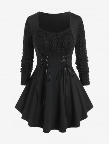 Plus Size Cable Knit Panel Mixed Media Lace Up Tee