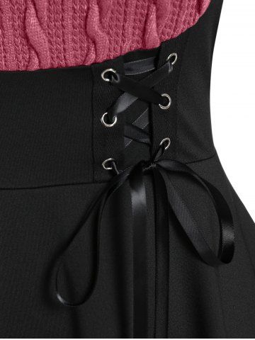 Plus Size Cable Knit Panel Mixed Media Lace Up Tee