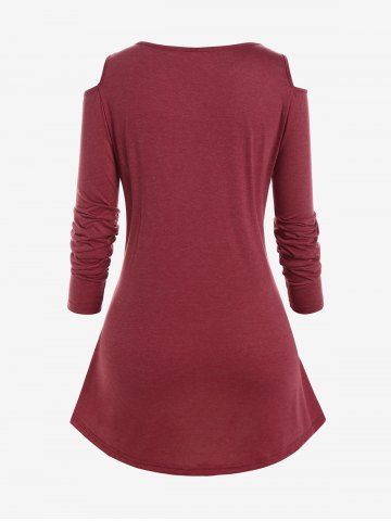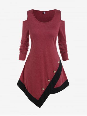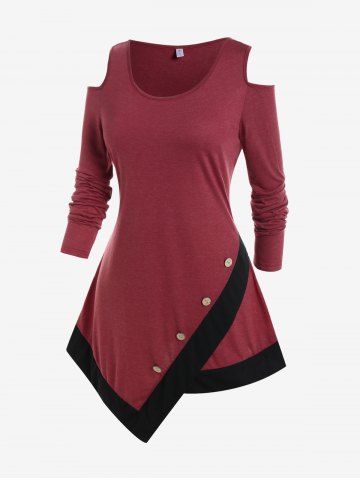 c*****74Plus Size Cold Shoulder Ruched Asymmetric Plunge TeeColor: DEEP RED Size: L | US 12This one fit a bit larger than I expected. Using an undershirt will fix that, though. The front hangs just a bit awkwardly, but that could also be my current body shape. Overall it's true to color and feels nice on.