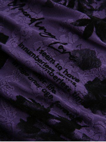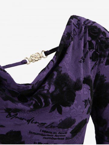 Plus Size Cowl Neck Poet Sleeves Rose Flower Letters Flocking Jacquard Embroidered Cinched Chain Top - Purple - L | Us 12