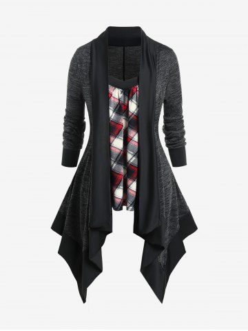 s*****e4Plus Size Plaid Faux Twinset Ruffled Asymmetric TeeColor: DARK GRAY Size: 2X | US 18-20I really like this blowes it's a tank top and a Shawl sewn together and it's comfy and very flattering to my chest and my husband loves it very much I just wish that I maybe got a size down but its fine and I also wish that you could change sizes easier but it's ok still love it and still looking good
