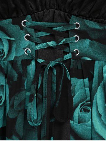 Plus Size Flare Sleeves Rose Flower Printed Lace Up Chiffon Layered Ruched Bust Valentines Top - Deep Green - 4x | Us 26-28