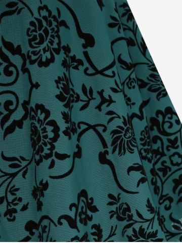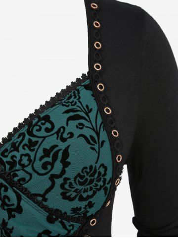 Plus Size Floral Mesh Flocking Lace Up Lace-trim Grommet 2 in 1 Long Sleeves Corset Top - Deep Green - 2x | Us 18-20