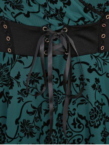 K*****n5Plus Size Floral Mesh Flocking Lace Up Lace-trim Grommet 2 in 1 Long Sleeves Corset TopColor: DEEP GREEN Size: 1X | US 14-16I love it. I might get other colors of it. I own the red version, and these one I might get a purple version just to have set.