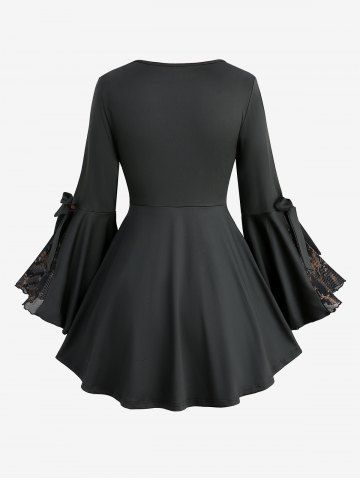 Plus Size Flowers Leaf Print Ruffles Ruched Spider Shaped Zipper Bowknot Flare Sleeve 2 In 1 Top - Black - 4x | Us 26-28